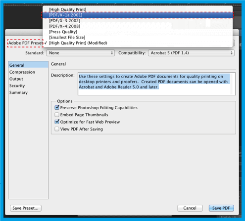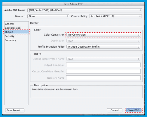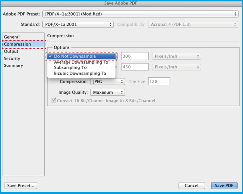 .Tada pasirinkite , o dešinėje pusėje . Ši parinktis užtikrina, kad failą išsaugosite be jokių spalvų raginimų, tada spustelėkite Išsaugoti išankstinį nustatymą..., išsaugokite šiuos PDF išankstinius nustatymus bet kokiu norimu pavadinimu, kad .